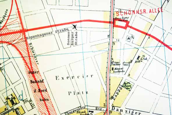 | 1958 Pharusplan Die Sektorengrenze zwischen Sowjetischem und Französischem Sektor verlief ab 1945 entlang der Gleise der Nordbahn. Der Gleimtunnel war anfangs noch ohne Kontrollen passierbar, allerdings nahmen die Restiktionen für Bewohner, die im Prenzlberg wohnten und im Wedding arbeiteten, nach der Währungsunion zu. Die Luftangriffe richteten sich in der Gegend um die Kopenhagener vor allem gegen das Nordkreuz der Bahn und die Ringbahn. 1944 wurde die Schönfließer Brücke getroffen und zerstört, die darin enthaltenen Leitungen für Wasser, Abwasser, Gas und Strom danach über eine Behelfsbrücke geführt. Ein merkwürdiges Kästchen am nördlichen Ende der Sonneburger zeigt die Ratlosigkeit des Kartenzeichners angesichts dieser merkwürdigen Nichtbrücke. Ansonsten blieben die Bombenschäden im Prenzlberg vergleichsweise gering, allerdings führte eine der Hauptangriffslinien der Sowjetarme von Norden über den Exer, so dass in den Straßenkämpfen noch zahlreiche Häuser, vor allem auf den Eckgrundstücken, ausbrannten. Hier wurden in den ersten Nachkriegsjahren recht schnörkellose Neubaublöcke errichtet. Für das Deutschlandtreffen der Jugend 1951 wurde das Gelände des Exer umgestaltet, die einstige Rudolf-Mosse-Straße verschwand teilweise unter den Sportanlagen und wurde offiziell aufgehoben. Die Sonnenburger endet seitdem vor einem Neubau an der Gaudy-Straße.  |