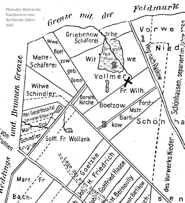 1822  Plan der Hufen im Nordosten von Berlin  Das Kreuz befindet sich ungefähr dort, wo später das Weiszheithaus gebaut wurde. Nummer 1: Schönhauser Allee Nummer 2: ungefähre Lage des späteren Arnimplatzes, an dessen Stelle sich zuvor ein flacher See in einer eiszeitlichen Vertiefung befand. Nummer 3: Verlauf der späteren Gleimstraße zwischen den Hufen von Boetzow und Bartikow Der Verkauf von Grundbesitz vor den Toren der wachsenden Stadt machte die Alt-Eigentümer reich. Familie Boetzow beispielsweise, ursprünglich Bauern aus Oranienburg (das vor 1652 "Bötzow" hieß) besaß um 1885 etwa 450 ha Land. Das "Jahrbuch der Millionäre" von 1913 verzeichnet Julius Albert Bötzow als einen der 20 reichsten Menschen im Deutschen Reich.  |