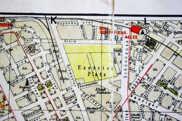 1890  Jul. Straubes Illustrierter Plan von Berlin Die Kopenhagener Straße erschloss die Parzellen parallel zur Ringbahn, die zwischen 1867 und 1877 gebaut wurde und die Fernbahnlinien aus Schlesien, Königsberg, Schwedt, Stettin, Hamburg und Lehrte, Anhalt, Görlitz, Dresden und Potsdam miteinander verband. Südlich der Kopenhagener lag der ursprünglich etwa 25 ha große Exer, seit 1825 Exerzierplatz des "Kaiser Alexander Garde-Grenadier-Regiments Nr. 1" (kaserniert an der Alexanderstraße, später am Kupfergraben). Auf dem nicht mehr militärisch genutzten Exer trainierte ab 1892 die Fußballmannschaft Hertha Berlin. Auf dieser Karte ist übrigens der, später als Verlängerung der Gleimstraße gebaute, Tunnel unter dem Gelände der Nordbahn noch als Verlängerung der Kopenhagener, und die, später in Fortsetzung der Sonnenburger gebaute Brücke über die Ringbahn als Verlängerung der Ystader Straße eingezeichnet.  |