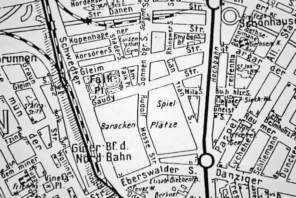 | 1925 Silva-Plan  1903/1904 entstand der Gleimtunnel. In der Gegend um die Kopenhagener wohnten seitdem viele Arbeiter und Angestellte der Großbetriebe im Wedding. 1905 zog Hertha vom Exer auf den Scheberaplatz (am Bahnhof Gesundbrunnen). 1912 erwarb die Stadt Berlin auch den westlichen Teil des Exer-Geländes und baute darauf Sport- und Spielanlagen. 1913 wurde die Brücke in Verlängerung der Sonnenburger Straße eröffnet und Schönfließer Brücke getauft, nach der Straße nördlich der Ringbahn. Der südliche Teil der Sonnenburger wurde 1920 nach dem Presseunternehmer und Mäzen Rudolf Mosse benannt. Anfang der 20iger Jahre baute die BEWAG an der Ecke Sonnenburger- und Kopenhagener Straße ein Umspannwerk, in dem die ankommende 100 Kilovolt-Strom auf Netzspannung transformiert wurde. Elektrifiziert wurde auch die S-Bahn, die hinter dem Weiszheithaus im Ringbahngraben fuhr und die Stationen Schönhauser Allee mit Pankow, Wollankstraße und Gesundbrunnen verband. Nach dem ersten Weltkrieg entstand auf dem Exer eine Holzhaus-Siedlung, u.a. für Flüchtlinge aus den jetzt polnischen Ostgebieten des Reiches.  |