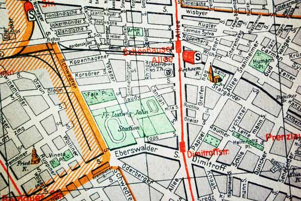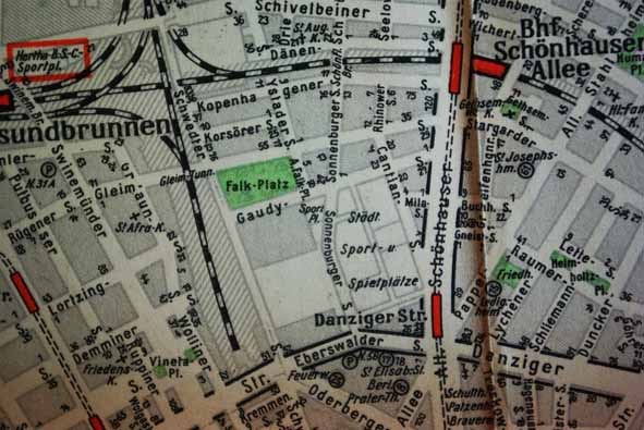 1936 Olympiastadtplan Dieser Plan wurde 1936 speziell für die Besucher der Olympischen Spiele aufgelegt und kennzeichnete besonders Sportstätten und Anfahrtswege. Links oben im Bild ist das Stadion von Herta BSC zu sehen, wo die Gruppenspiele des Fußballwettbewerbs stattfanden. 1935 wurde von den Nazis der Name des ihnen als Jude und Liberaler verhassten Rudolf Mosse aus dem Straßenbild getilgt. Die Verfolgung trieb jüdische Einwohner in die Emigration, während gleichzeitig viele Juden aus den Provinzen Schutz in der Großstadt suchten. Im Süden des Exer entstanden 1937 noch die Wohngebäude zwischen Eberswalder und heutiger Topsstraße, ansonsten kam die Bautätigkeit im Bezirk weitgehend zum Erliegen.  |