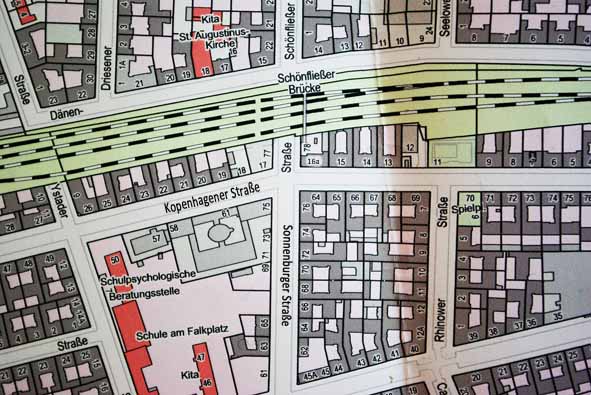2008 Verwaltungsplan Nach dem Bau der Mauer 1961 schlief der Kiez zwischen Bahngelände, Exer und Ringbahn regelrecht ein. Gewerbe und Läden schlossen, in den Bombenlücken entstanden Spiel- und Parkplätze. Die letzten Querstraßen vor der Grenze durften nur mit Passierschein betreten werden. Ein Großaufgebot von Polizei und Stasi musste jedes Mal die Heimspiele des langjährigen Fußballmeisters BFC Dynamo im Stadion sichern. Schon in den letzten Jahren vor der Wende boten die verfallenden Häuser und der Kontrollverlust der Kommunalen Wohnungsverwaltung im Kiez Freiräume für alternative Kultur. In der Kopenhagener siedelten sich besonders viele Künstler an. Vor und auch nach der Wende war die Straße Drehort zahlreicher Fernseh- und Kinofilme. Der Sanierungsboom verursachte einen teils krassen Bevölkerungswechsel. Heute liegt der Prenzlberg, einst Schlusslicht der Berliner Sozialstatistik, auf einem der "Spitzenplätze".  |
